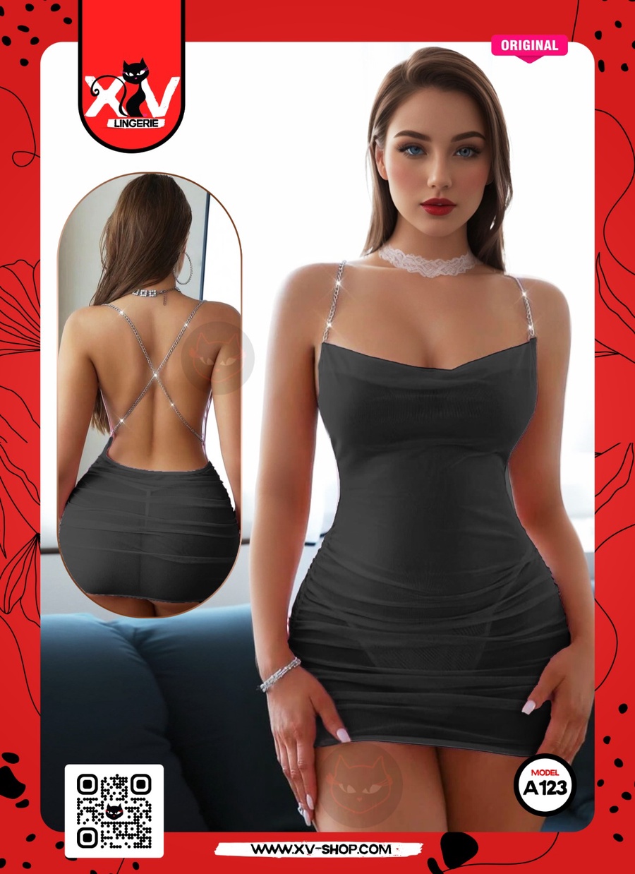 بيبي دول تل أسود بحمالة سلسلة جذابة، مع ظهر على شكل إكس لإطلالة مثيرة وجذابة. القَصّة مضبوطة لتبرز القوام بشكل أنثوي ملفت، والخامة ناعمة ومريحة، والموديل مثالي للاستخدام داخل البيت لمحبي الإطلالة الجريئة والمثيرة.