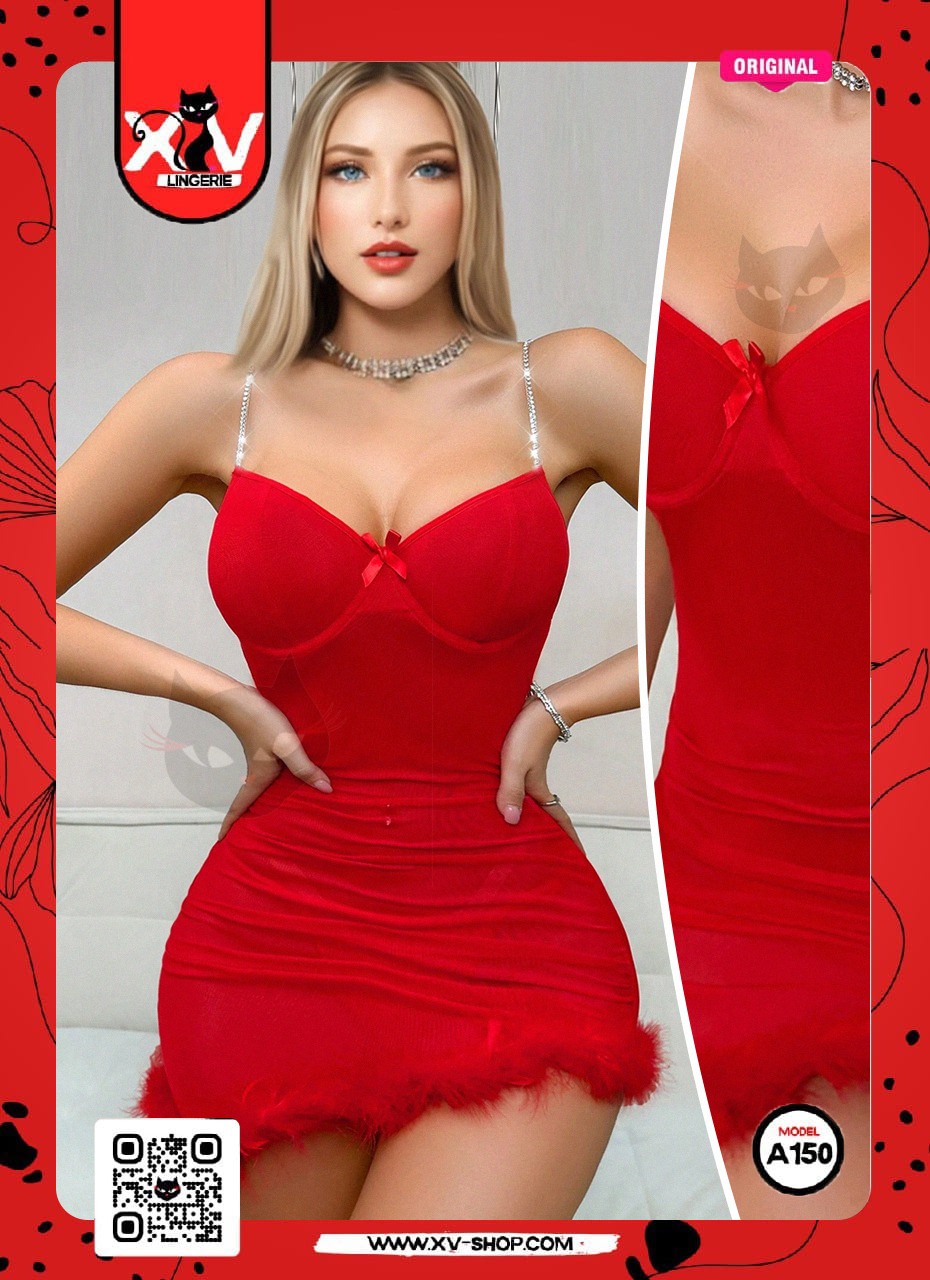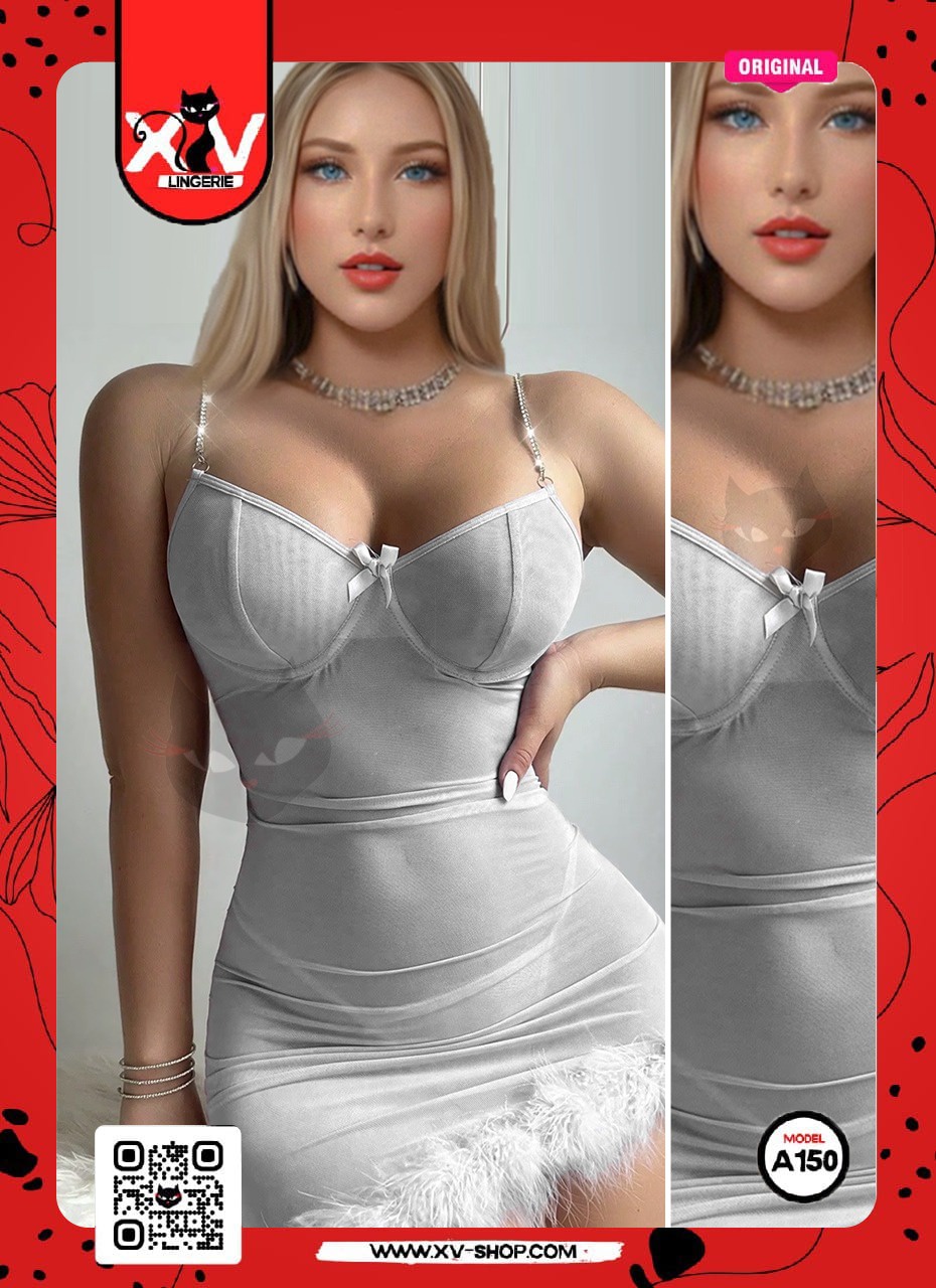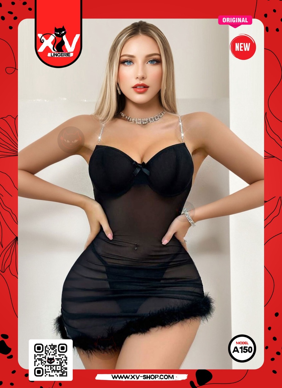 لانجيري أسود قصير من التل، مزود بفرو خفيف يضيف لمسة أنثوية جذابة، وحمالة سلسلة رائعة تزيد من الإثارة والجاذبية. القَصّة مظبوطة والخامة ناعمة ومريحة، والموديل مثالي لمحبي الإطلالة الجريئة والمثيرة داخل البيت.