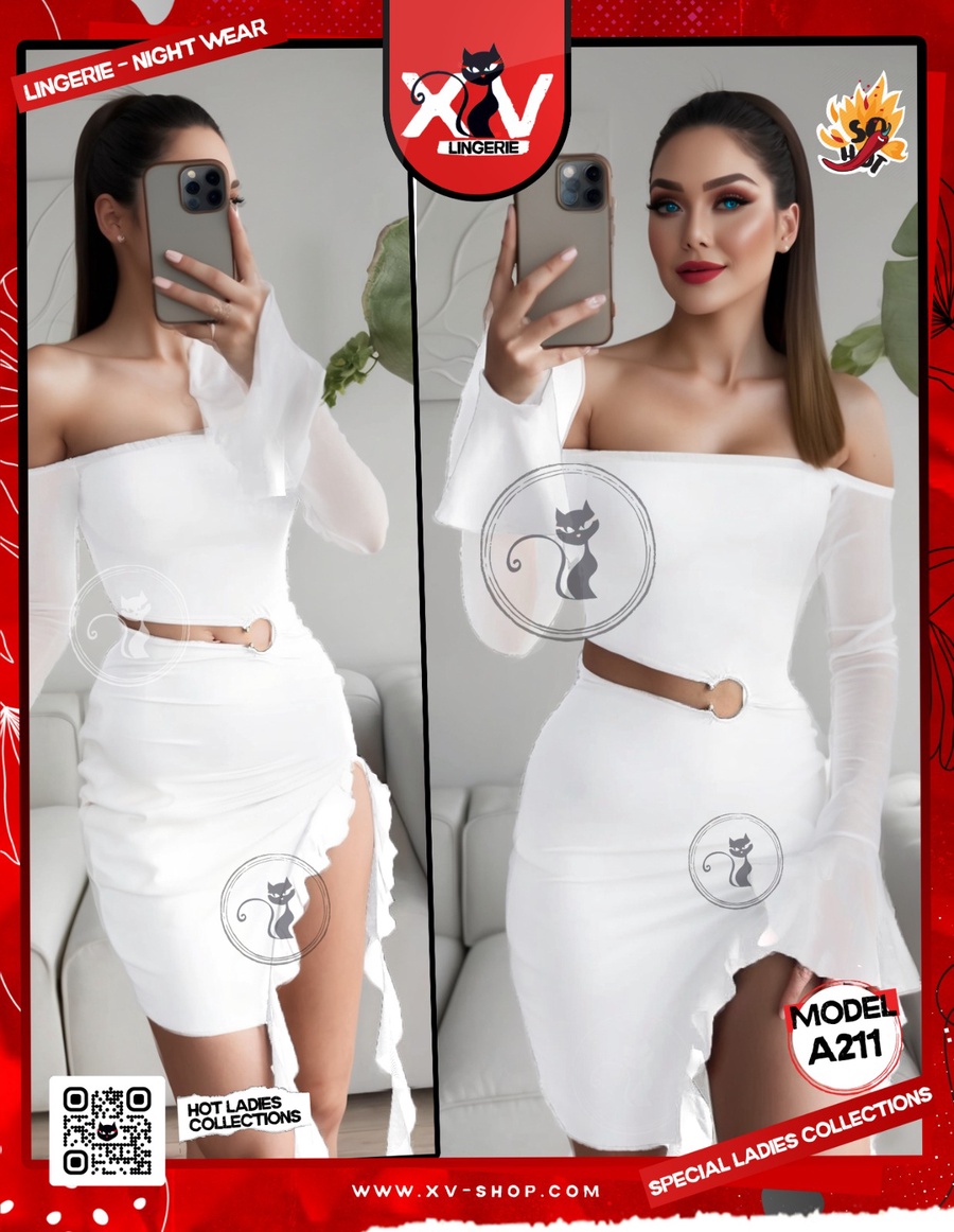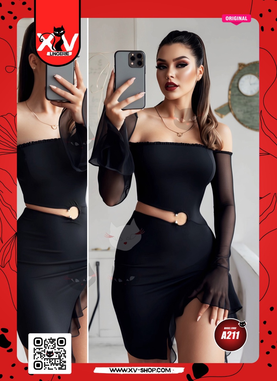 فستان أوف شولدر بتصميم جذاب، فتحة عند البطن تضيف لمسة مثيرة، وصدر مسطح يعطي شكل متناسق، مع كورنيش حوالين الرجل يبرز القوام بشكل ملفت. القَصّة مظبوطة والخامة مريحة، مثالي لمحبي الإطلالة الجريئة داخل البيت.