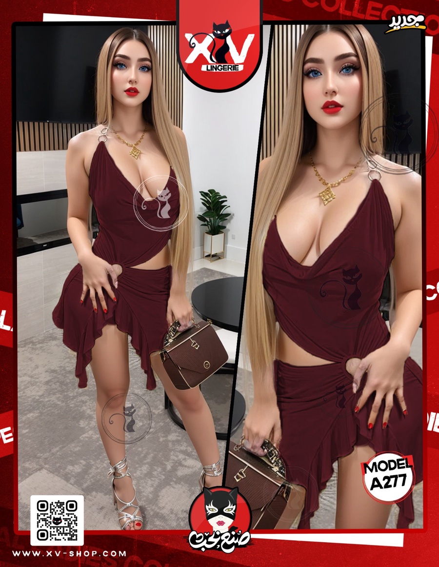 لانجيري قطعتين بتصميم جريء، مكوّن من جيبة قصيرة مفتوحة بتدي حركة وشكل جذاب، مع توب حمالة مفتوح من عند الصدر يبرز التفاصيل بشكل أنيق ولافت. خامة ناعمة ومريحة، والموديل معمول للي بيحبوا الستايل الجريء داخل البيت.